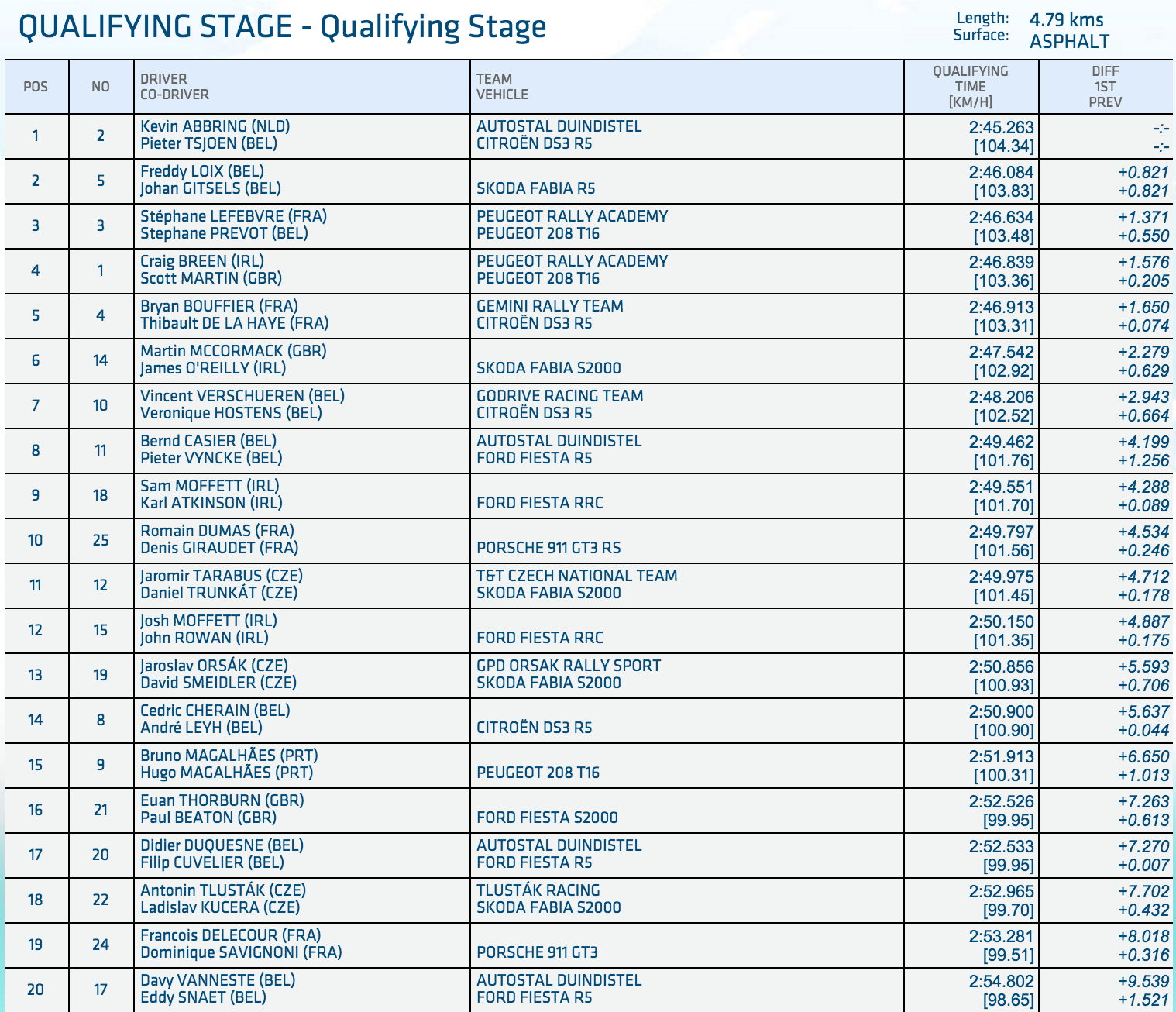 Nejrychleji si s měřeným průjezdem kvalifikační zkoušky poradila ad hoc složená posádka v podobě Kevin Abbring - Pieter Tsjoen, kdy i muž na pravé sedačce má nepoměrně více zkušeností s řízením vozu, než se čtením not. Ale dnešní realita je taková, že za volantem seděl Holanďan a ten zajel na 4,79 kilometru dlouhé zkoušce nejrychlejší čas a o necelých devět desetin porazil Freddyho Loixe, pro nějž jde o premiéru s vozem Škoda Fabia R5. Třetí příčku pak bral Stéphane Lefebvre, jehož start na Ypres rally je odměnou za jeho loňské vítězství v JERC. I další příčky v TOP 10 kvalifikace braly převážně speciály specifikace R5, výjimku pak tvořily Fabie S2000 Martyho McCormacka, Fiesta RRC Sama Moffeta a Porsche 911 Romaina Dumase.